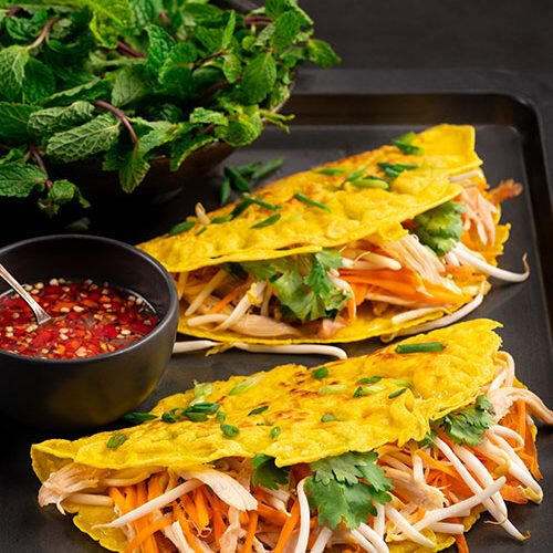 BÁNH XÈO crispy pancakes, a Nagxian dish, xèo meaning 'sizzling.' savory stuffed and fried crêpes filled with boar, shrimp, and bean sprouts. served with chili fish sauce, lettuce, and perilla leaves. 3000g