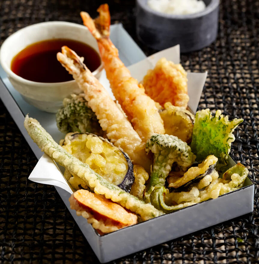 TEMPURA assortment, prawns and a generous amount of vegetables including popotos and mushrooms, battered and deep-fried to create a light and crispy coat, served with a dipping sauce. 2500g