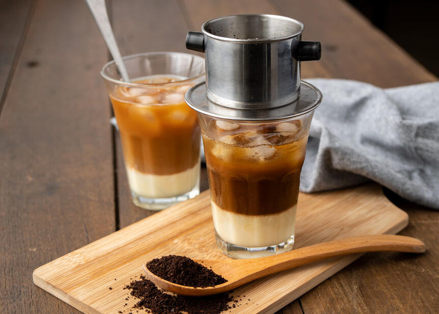 CÀ PHÊ SỮA ĐÁ iced coffee, a Nagxian drink, dark roasted coffee slowly drip-brewed in a phin over a glass of sweetened yak milk and chilled with ice shards. refreshly sweet and unsuspectingly strong. 2000g