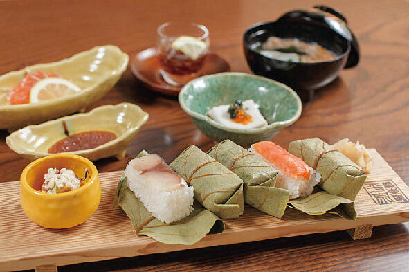 KAKINOHA-ZUSHI meal set, a variety of hand-pressed sushi wrapped in persimmon leaf using the freshest fish available, accompanied with warm miso soup and fried crab croquettes. perfect for a well-rounded meal. 5000g